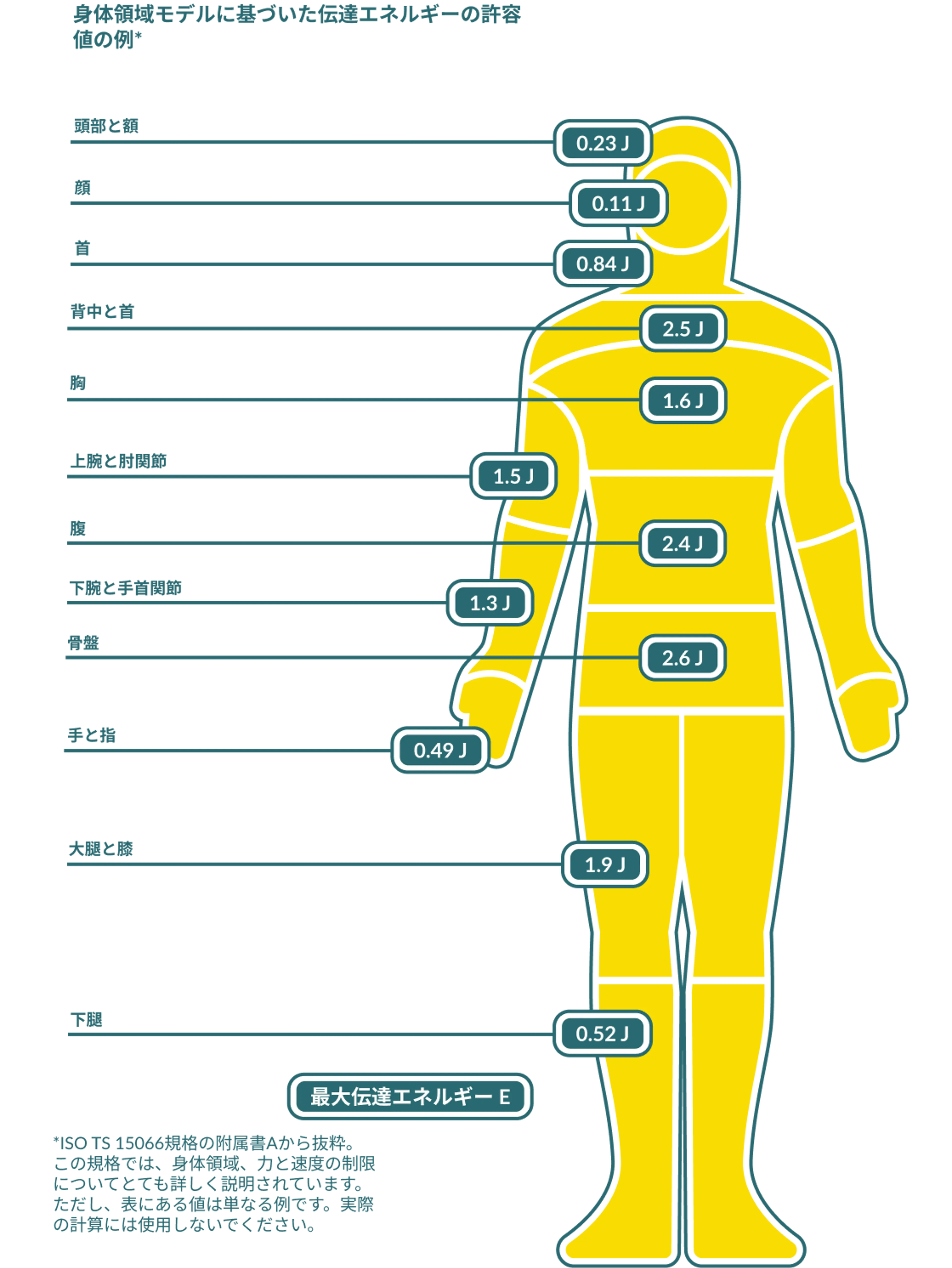 これらの制限内で移動する協働ロボットは、人間とロボットの相互作用に対して安全であると考えられます。ただし、そのようなアプリケーションが自動的に安全であることを意味するわけではありません。ロボットとロボットが扱うツール (エンド エフェクタ) の全体的なコンテキストを慎重に考慮する必要があります。